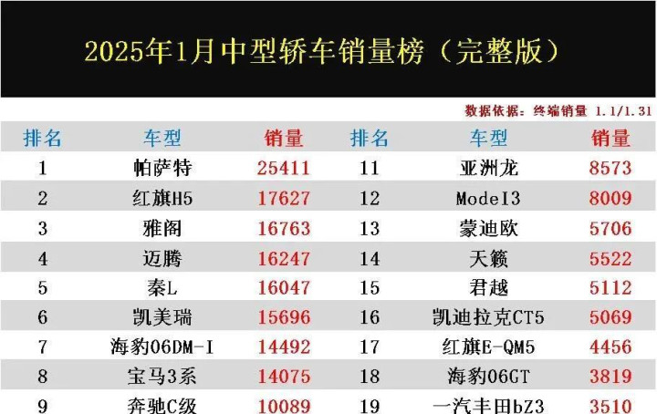 从数据来看,2025年1月,中型轿车市场销量超过万辆的车型共有9款,这说明市场竞争依然激烈,消费者选择也更加多样化。帕萨特的2.5万辆销量,虽然遥遥领先,但也只占据了市场份额的一小部分。